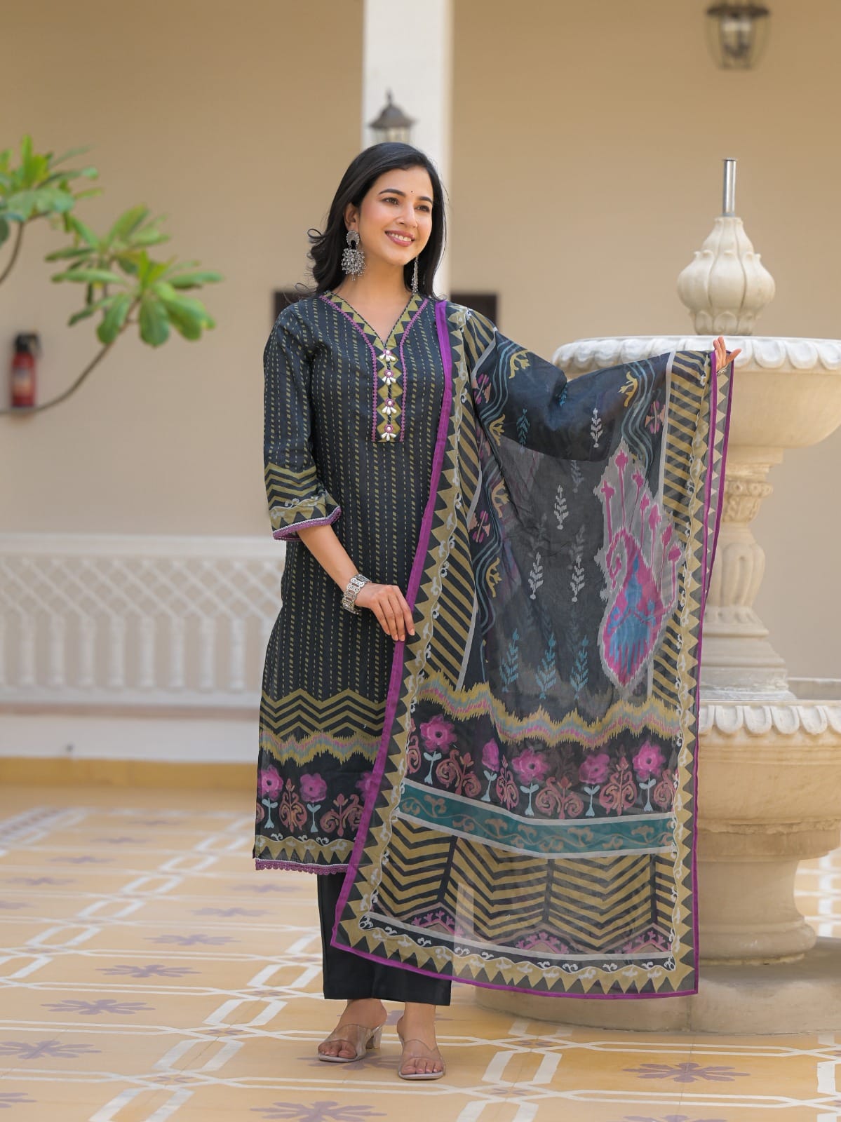 A woman wearing a black printed salwar kameez with golden stripes, floral borders, and a colorful patterned dupatta, paired with black trousers, silver jhumkas, and nude sandals, standing in an elegant courtyard setting.