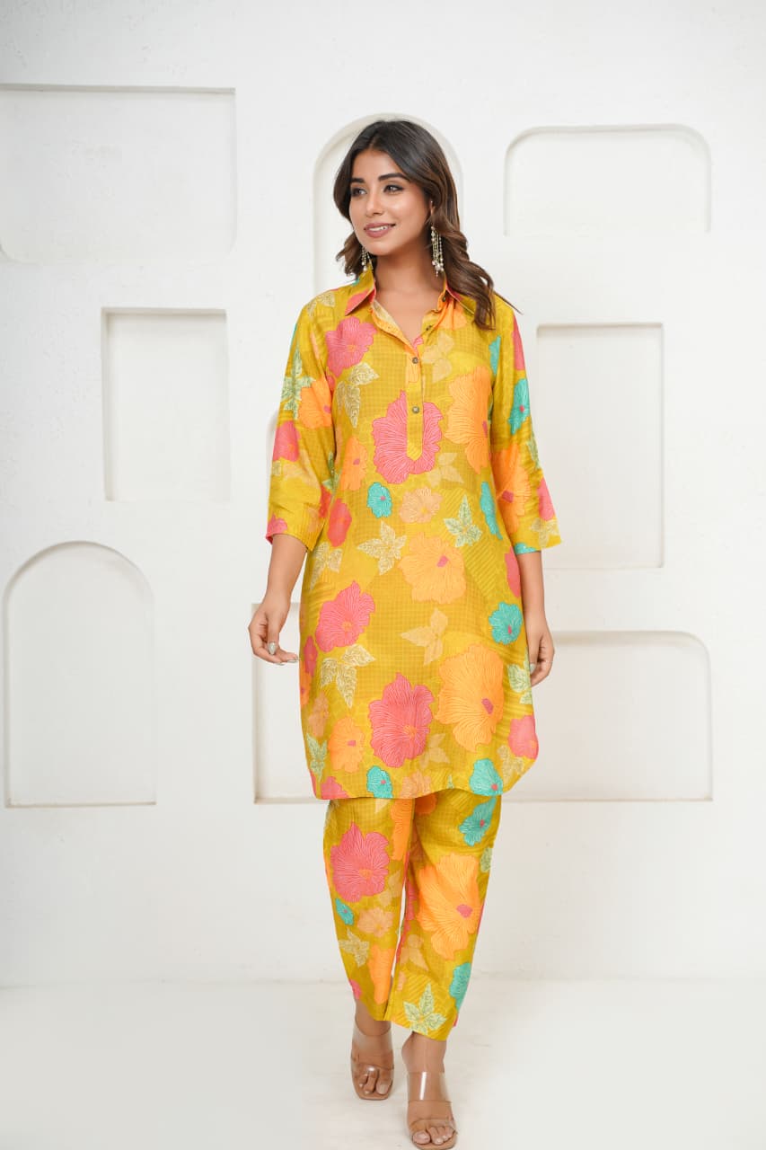 A woman with long, dark hair is standing against a textured white wall. She is smiling and looking to her left. She is wearing a bright yellow kurta set with a bold floral print in pink, orange, and blue. The top is a collared, button-down style with three-quarter sleeves. She is wearing long earrings and transparent heeled sandals.