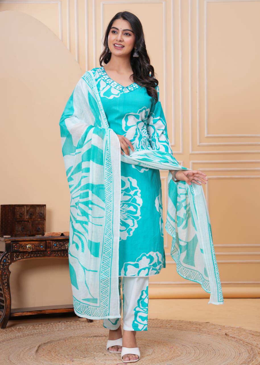 A woman wearing a turquoise and white floral printed salwar suit with a matching dupatta, paired with white heels and silver earrings, smiling in an indoor setting.