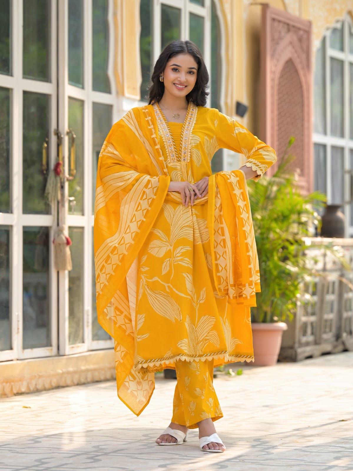 A woman with long, dark hair is standing outdoors in front of a yellow building with large windows. She is smiling and looking directly at the camera. She is wearing a bright yellow kurta set with a white floral print. The outfit includes a matching dupatta that she has draped over her shoulders. The kurta has an embellished neckline, and she is wearing a simple necklace and earrings. She is also wearing white sandals.