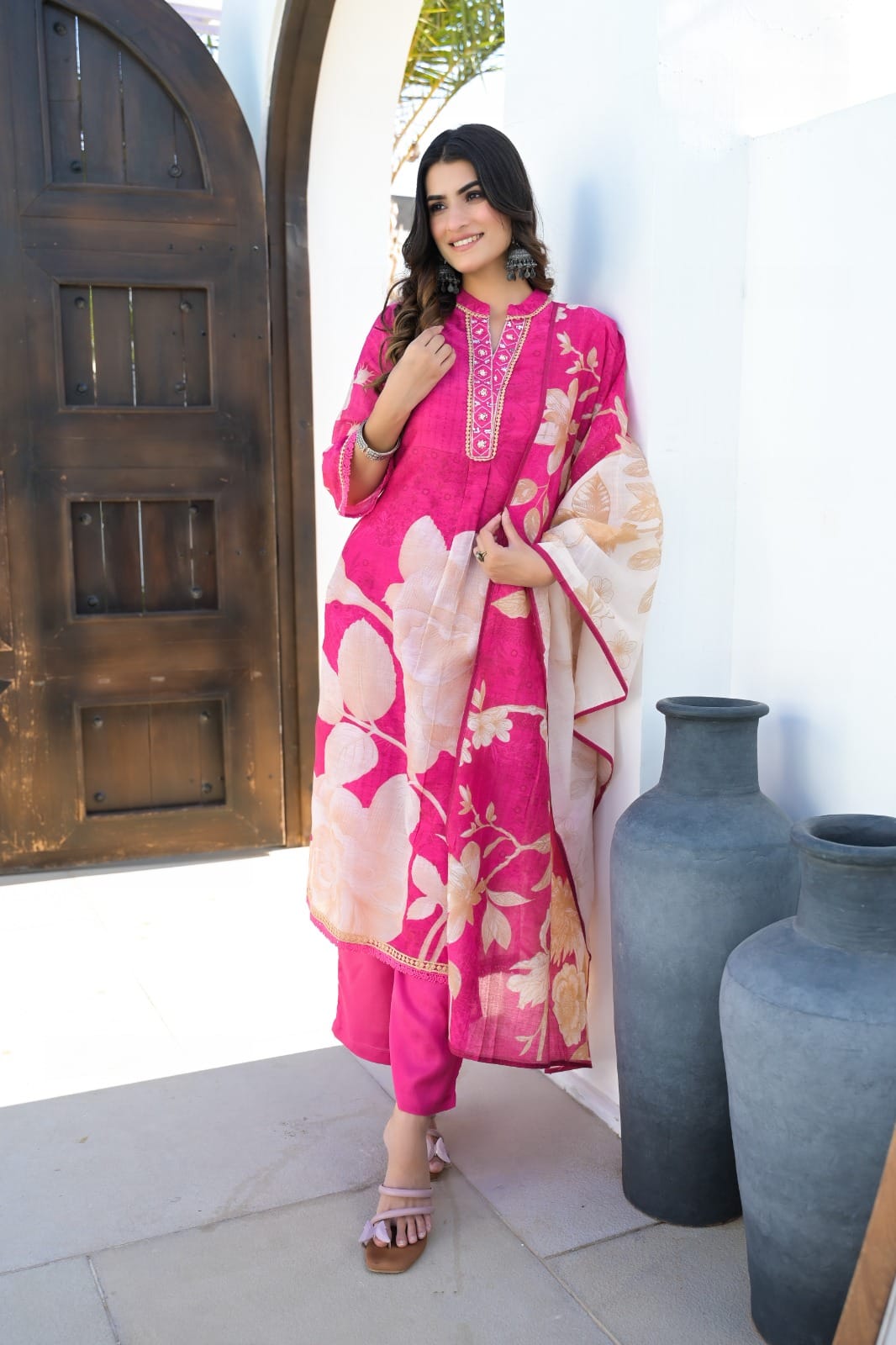 A woman with long, wavy dark hair is leaning against a white wall outdoors. She is smiling and looking to her left. She is wearing a bright pink kurta set with a white and pale pink floral print. The kurta has an embellished neckline. She is holding a matching dupatta with the same floral print and a pink border. She is wearing sandals and has on silver earrings. Two large grey vases are visible to her right.